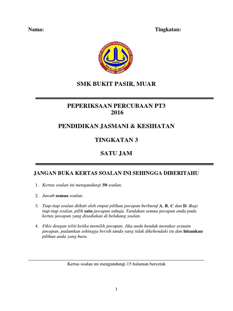 Soalan Pjk Percubaan Pt3 Tingkatan 3 2016 Pdf